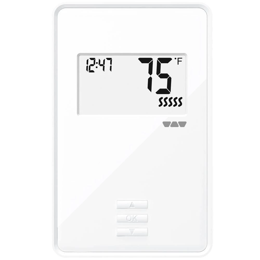 DITRA-HEAT-E-R is a non-programmable digital thermostat used to control the DITRA-HEAT-E-HK heating cables (either 120-Volt or 240-Volt). The thermostat features a 5 mA built-in Ground Fault Circuit Interrupter (GFCI) with indicator light and includes a floor temperature sensor. DITRA-HEAT-E-R is operated via a simple on/off switch. Two heating cables may be connected to the thermostat, up to the total heating load limit of 15 Amp.