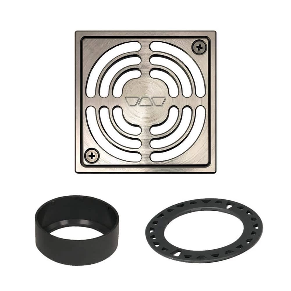 - Package includes: 4 in. square grate and frame, height adjustment collar and lateral adjustment ring