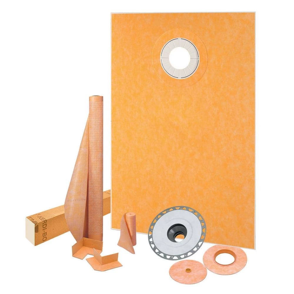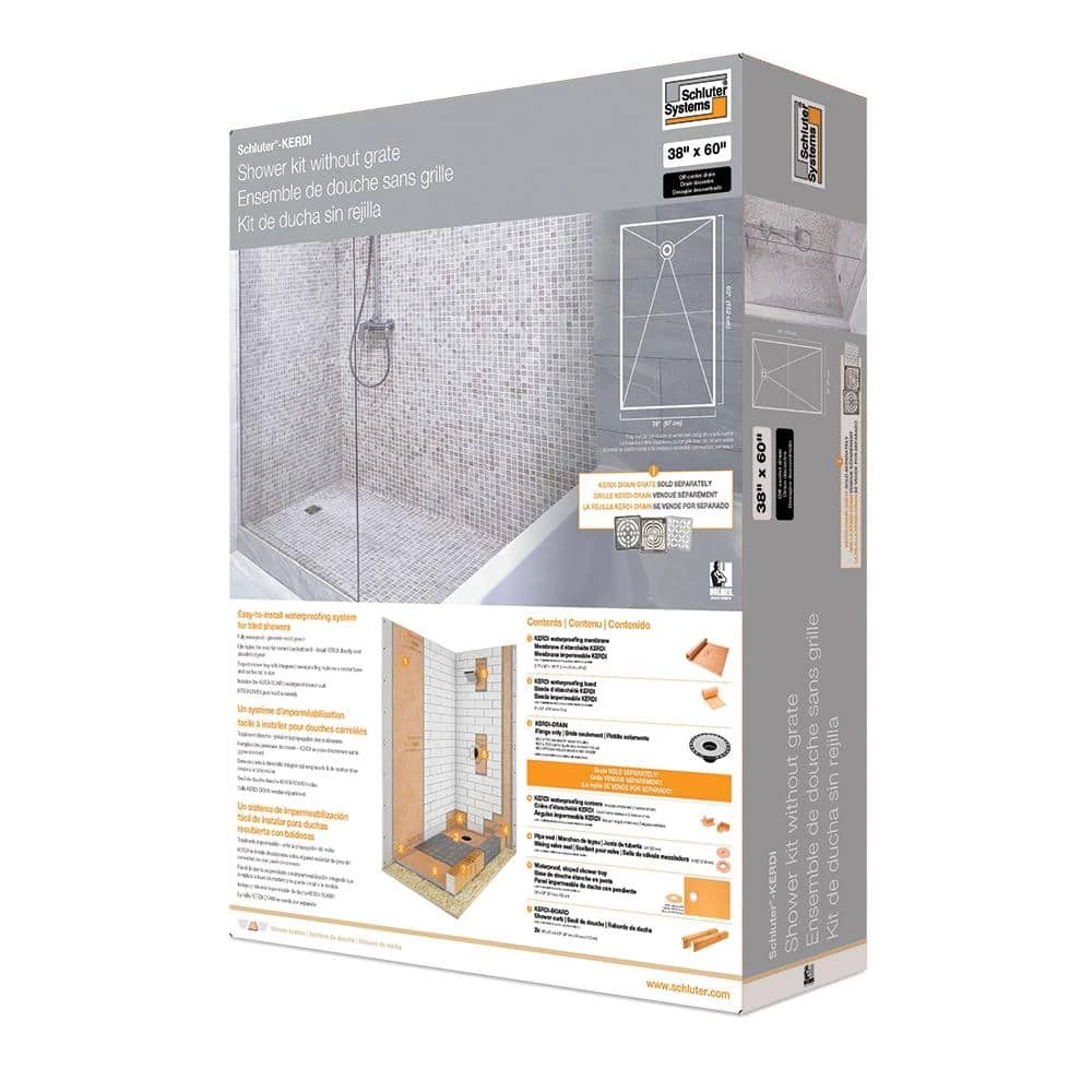 The Kerdi-Shower-Kit without the grate is a kit containing the components to create a watertight shower assembly. The prefabricated sloped shower tray with integrated Kerdi waterproofing eliminates the need for a mortar bed. Kit includes a shower tray, Kerdi-Board-SC shower curb, Kerdi waterproofing membrane, Kerdi-Band waterproofing strip, Kerdi-Kereck corners, Kerdi-Seal pipe seal and mixing valve seal and Kerdi-Drain flange. The Kerdi-Shower-Kit without the grate is designed for use with the Kerdi-Drain grate which is sold separate.