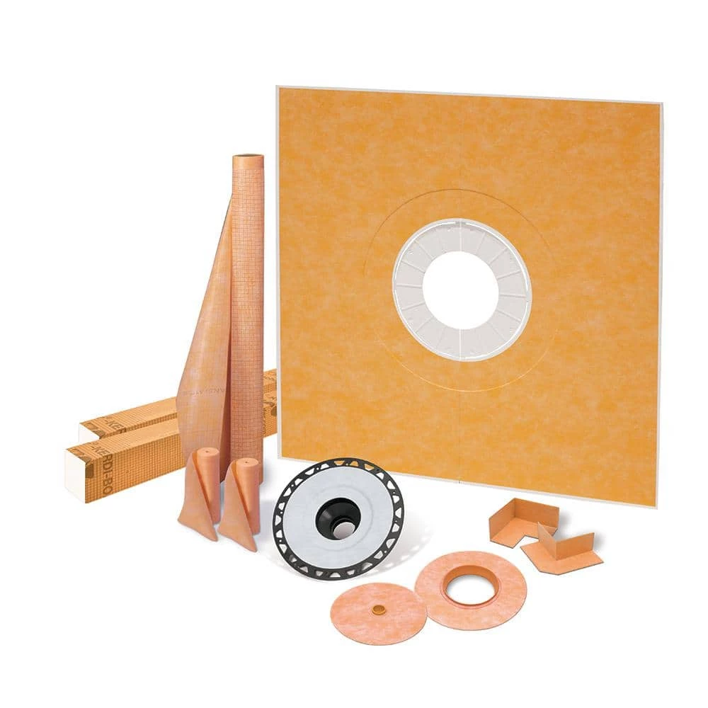 The Kerdi-Shower-Kit without the grate is a kit containing components to create a watertight shower assembly. The prefabricated sloped shower tray with integrated Kerdi waterproofing eliminates the need for a mortar bed. Kit includes a shower tray, Kerdi-Board-SC shower curb, Kerdi waterproofing membrane, Kerdi-Band waterproofing strip, Kerdi-Kereck corners, Kerdi-Seal pipe seal and mixing valve seal and Kerdi-Drain flange. The Kerdi-Shower-Kit without the grate is designed for use with the Kerdi-Drain grate which is sold separate.