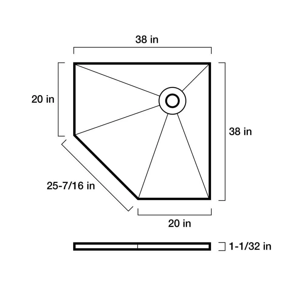 - Off-center drain placement: 12 in. from 38 in. sides of tray