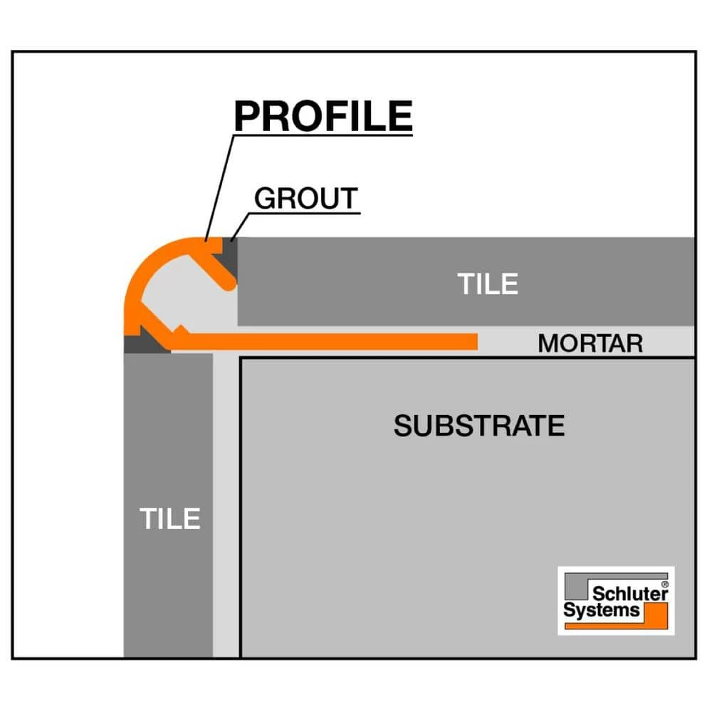 Rondec is a finishing and edge-protection profile for tiled edges and outside wall corners. The reveal creates a rounded edge along the tile. It is ideal for finishing the edge of tiled backsplashes, countertops and niches. The Rondec profile has an integrated joint spacer which ensures a uniform grout joint between the tile and profile. Inside and outside corners for the Rondec profile are available separately.